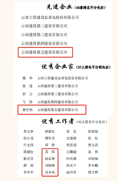 近日,昆明市建筑業(yè)協(xié)會(huì )公布2025年度評先創(chuàng )優(yōu)結果,公司榮膺2025年度昆明市建筑業(yè)“先進(jìn)企業(yè)”,實(shí)現連續五年榮獲該項榮譽(yù);公司黨委書(shū)記、董事長(cháng)、迪慶公司董事唐生炳獲評昆明市建筑業(yè)“優(yōu)秀企業(yè)家”;同時(shí),蘇偉、趙志坤、劉俊峰、肖本風(fēng)4名職工獲評昆明市建筑業(yè)“優(yōu)秀工作者”。