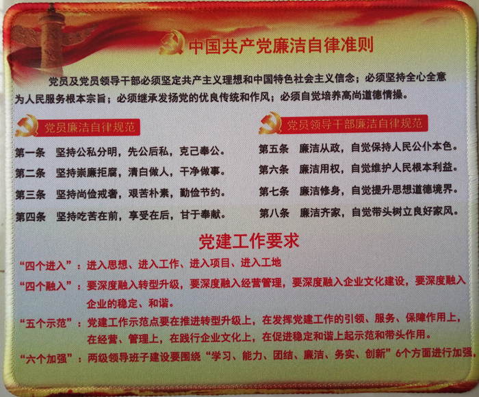 直管部推出每天5分鐘,聽(tīng)音頻、學(xué)黨章,讓黨員同志更簡(jiǎn)單、更輕松的將黨章內容牢記心中。除此之外,直管部將工程項目展示圖與黨員領(lǐng)導干部廉潔自律規范、黨建工作要求的內容和印有“愛(ài)崗敬業(yè)珍惜崗位 誠實(shí)守信 依法經(jīng)營(yíng)”企業(yè)文化的鼠標墊發(fā)放給全體員工。在宣傳企業(yè)文化的同時(shí),讓更多的黨員同志能夠發(fā)揮先鋒作用,帶動(dòng)更多的人,將學(xué)習的理論知識通過(guò)實(shí)踐、實(shí)踐、再實(shí)踐。