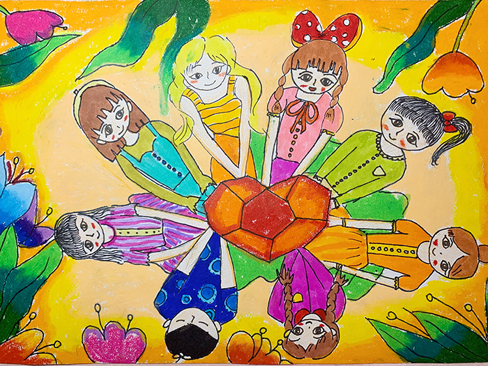 寓意:此畫(huà)作創(chuàng )作了我愛(ài)我的祖國,祖國加油!我們是祖國未來(lái)的花朵,我們是七彩少年,畫(huà)中我們共同手捧愛(ài)心,那是我親愛(ài)的祖國——中國,我們齊心協(xié)力,眾志成城,我們同在一片藍天,懷著(zhù)同一顆熱愛(ài)祖國的心,我們會(huì )用我們勤勞的雙手共建我們美麗富饒的中國,我們都愛(ài)我們的祖國,我以祖國為榮。