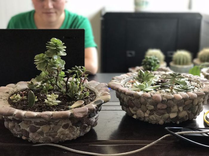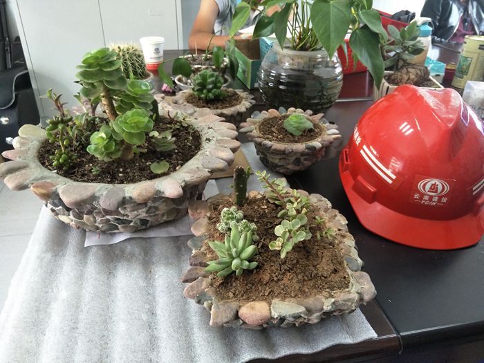 技術(shù)支持: 方森科技 今天晚飯時(shí)經(jīng)過(guò)材料室,無(wú)意間發(fā)現袁老師傅和小尤拿著(zhù)一桶小石子和小半袋水泥在那搗鼓著(zhù)什么,仔細一看,眼前的一幕讓我眼前一亮,只見(jiàn)他們一人拿著(zhù)小鏟子兌著(zhù)水攪拌水泥,一人在塑料盒周?chē)鷶[上小石子,不一會(huì )兒的功夫,一個(gè)個(gè)漂亮的小花盆閃亮登場(chǎng)啦。別說(shuō),這用塑料盒、水泥和小石子做出來(lái)的花盆還真是漂亮,再放上泥土,種上多肉植物,擺放在辦公桌上,真是這繁忙的項目駐地處里的“一股清流”啊。細問(wèn)才知道,原來(lái),這些漂亮花盆的材料都是“原生態(tài)”來(lái)的,塑料盒是吃完洗干凈的塑料飯盒,水泥是他們在水泥車(chē)卸貨的時(shí)候掃下來(lái)的水泥渣,就連小石子也都是從澄江邊上撿回來(lái)的。利用這些材料,袁老師傅和小尤親手“打造”出了辦公室里的一道靚麗的風(fēng)景。