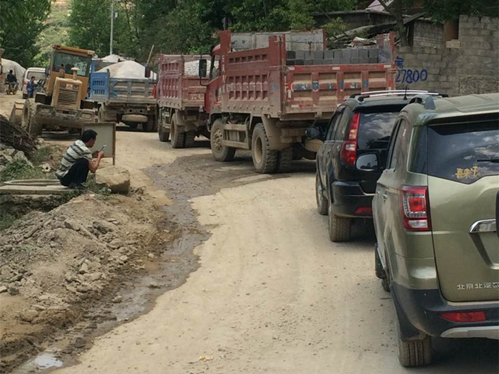 如果說(shuō)龍頭山項目是因“快”而難,那么樂(lè )紅項目就是因為“堵”而難,到過(guò)樂(lè )紅鎮的每個(gè)人對此都深有感觸。項目必經(jīng)的交通要道在地震后路況復雜,從龍頭山到樂(lè )紅鎮的鄉村道路在地震中遭到破壞正在維修,路上擁堵點(diǎn)多。所以盡管項目不大,但由于路況原因交通不暢,各項工作都很難開(kāi)展。