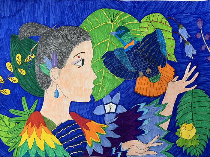畫(huà)中描繪了色彩絢麗的棕尾虹雉,頭部為綠色,藍綠色羽冠,上體紫藍綠色,羽干細而裸出,羽端呈匙狀,如同絲絨一般,全身羽毛都閃耀著(zhù)彩虹一樣的金屬光澤,又叫“彩虹鳥(niǎo)”和“九色鳥(niǎo)”。將絢麗多彩的“彩虹鳥(niǎo)”在心中、畫(huà)中擬人化,展開(kāi)豐富的想象,以人物的形象將鳥(niǎo)擬人成人物,又將美麗的少女形象地比擬成“彩虹鳥(niǎo)”。她們低聲細語(yǔ),輕聲呢喃。將心中對生命的愛(ài),對動(dòng)物、植物、綠色、美麗的家園、美好的愿景展示出來(lái)。反映了人與動(dòng)物,人與自然,和諧共生,和諧共處,你中有我,我中有你,你就是我,我就是你。形成一幅絢麗多彩的畫(huà)面。展現出小作者對美好事物的憧憬,內心的純凈與美好,體會(huì )到小作者內心的溫暖與美好。