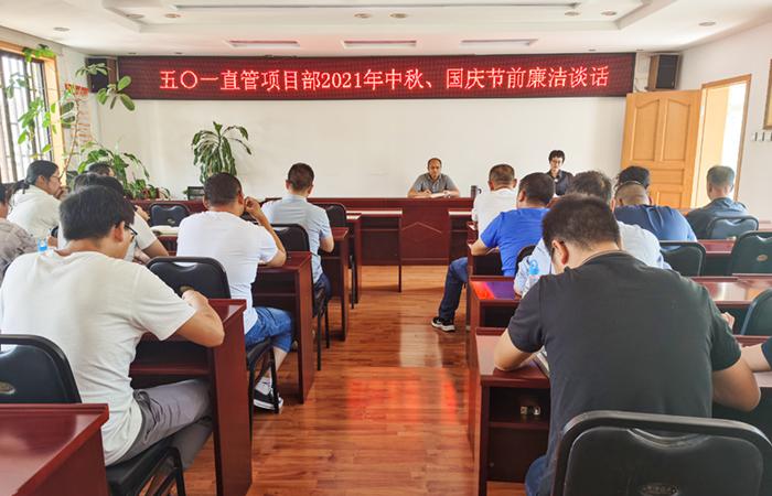 9月6日下午,五〇一直管項目部開(kāi)展中秋、國慶節前廉潔談話(huà),會(huì )議由黨支部書(shū)記王敏主持,直管部班子成員、科室負責人及項目經(jīng)理共計21人參會(huì )。