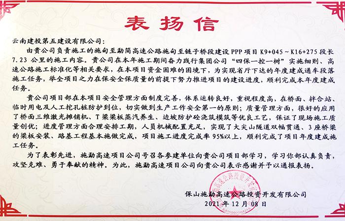近期,施鏈高速二分部在施工期間連獲總承包二部“先進(jìn)單位 流動(dòng)紅旗”;施甸縣姚關(guān)鎮山邑村民委員會(huì )贈“搭建民心工程 接通天長(cháng)地久”錦旗;收到業(yè)主單位保山施勐高速公路投資開(kāi)發(fā)有限公司《表?yè)P信》等3個(gè)獎勵,項目工作得到了上級單位、地方單位的充分肯定。