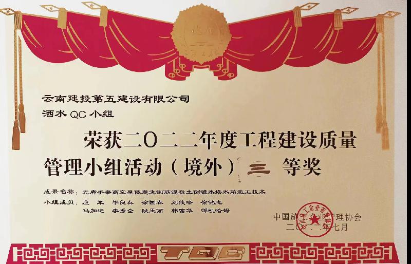 其中,榮獲中施企協(xié)優(yōu)秀QC成果三等獎1項、中建協(xié)優(yōu)秀QC成果5項(二等獎2項、三等獎1項)、云南省建筑業(yè)協(xié)會(huì )優(yōu)秀QC成果11項(一等獎3項、二等獎7項、三等獎1項)、榮獲昆明市建筑業(yè)協(xié)會(huì )優(yōu)秀QC成果5項(一等獎2項、二等獎3項)。