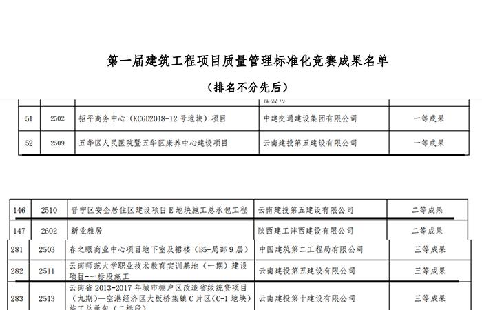 近日,中國建筑業(yè)協(xié)會(huì )質(zhì)量管理與監督檢測分會(huì )公布了第一屆建筑工程項目質(zhì)量管理標準化競賽的成果名單。公司參評的五華區人民醫院暨五華區康養中心建設項目獲一等成果、晉寧區安企居住區建設項目E地塊施工總承包工程獲二等成果,云南師范大學(xué)職業(yè)技術(shù)教育實(shí)訓基地(一期)建設項目-一標段施工獲三等成果。