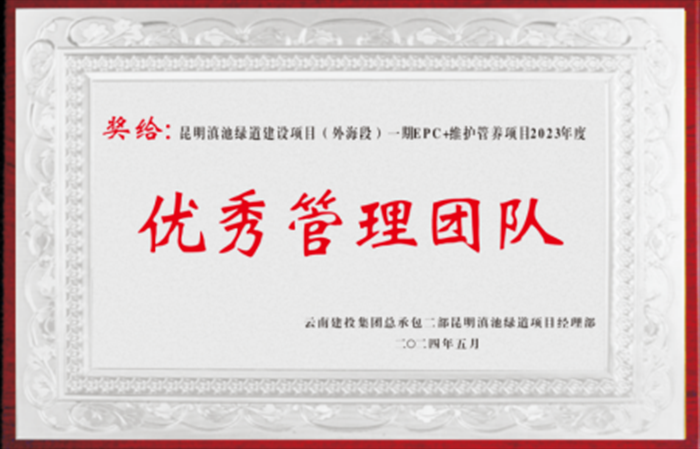 近日,昆明滇池綠道建設項目指揮部召開(kāi)2023年度優(yōu)秀個(gè)人、優(yōu)秀團體表彰會(huì )。昆明滇池綠道建設項目(外海段)一期EPC+維護管養土建七工區榮獲“優(yōu)秀管理團隊”榮譽(yù),項目經(jīng)理謝國飛榮獲“優(yōu)秀項目經(jīng)理”稱(chēng)號,項目資料員劉麗榮獲“優(yōu)秀個(gè)人”稱(chēng)號。