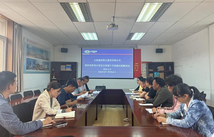 6月6日上午,第四直管項目部黨支部開(kāi)展端午節前廉潔提醒談話(huà),直管部領(lǐng)導班子、科室負責人及在昆職工共計16人參加會(huì )議。
