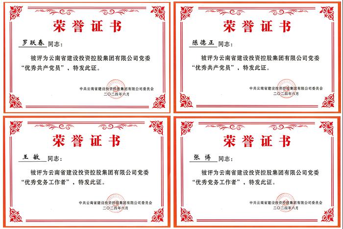 6月30日,云南建投集團黨委召開(kāi)慶祝中國共產(chǎn)黨成立103周年暨“兩優(yōu)一先”表彰大會(huì )。公司2名共產(chǎn)黨員獲評“優(yōu)秀共產(chǎn)黨員”榮譽(yù)稱(chēng)號,2名黨務(wù)工作者獲評“優(yōu)秀黨務(wù)工作者”榮譽(yù)稱(chēng)號。