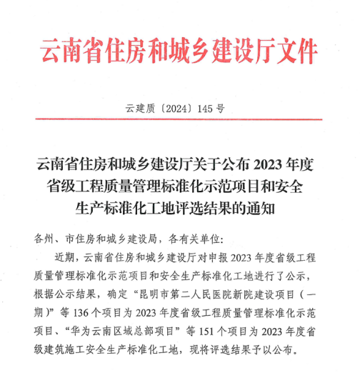 近日,云南省住房和城鄉建設廳揭曉了“2023年度省級工程質(zhì)量管理標準化示范項目和安全生產(chǎn)標準化工地”的評選結果,由公司第七直管項目部負責施工的云南藝術(shù)學(xué)院二期工程藝術(shù)實(shí)踐中心(含1#、2#、3#及5#、6#教學(xué)樓建設項目)、五〇八直管項目部負責施工的云南省婦女兒童發(fā)展中心建設項目及第二直管項目部負責施工的個(gè)舊市工人療養院提升改造項目榮獲2023年度省級安全質(zhì)量“雙標化”示范項目殊榮。