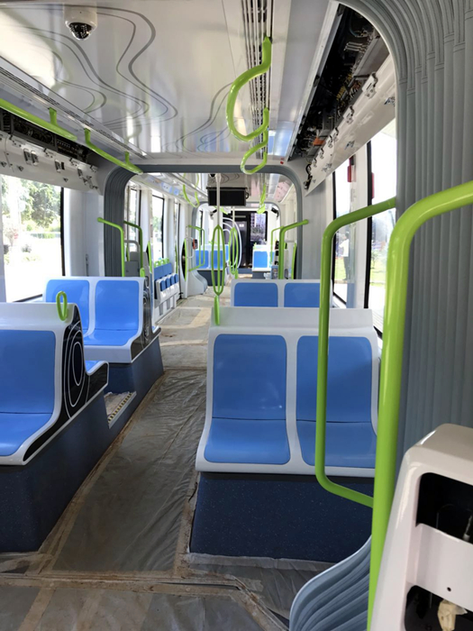 據悉,蒙自有軌電車(chē)內部裝飾取材于紅河州哈尼梯田,其中車(chē)廂頂部及座位側邊的裝飾取材于哈尼梯田靈動(dòng)的線(xiàn)條,現代中突顯著(zhù)紅河州濃郁的地域特點(diǎn)。車(chē)廂內梯田柔美的線(xiàn)條、藍白相間的座椅,寬大的玻璃窗,再加上車(chē)窗外美麗的風(fēng)景,使有軌電車(chē)的每一扇窗口都成了一幅流動(dòng)的風(fēng)景畫(huà)。