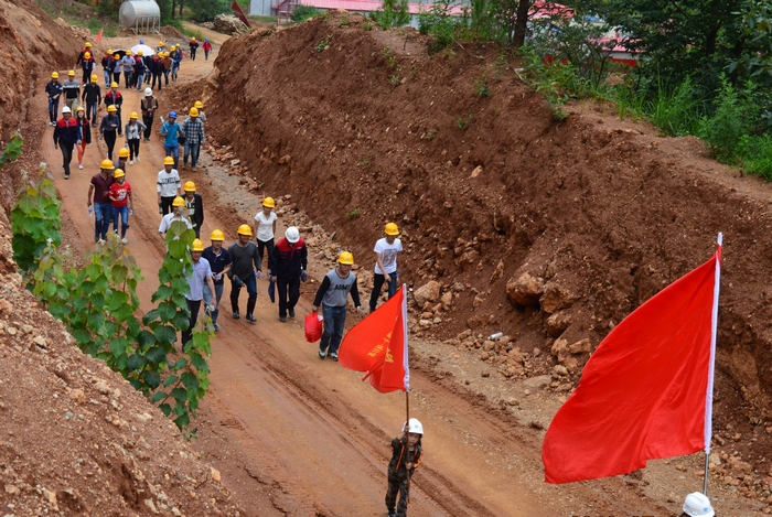 徒步隊伍中還有兩個(gè)放假來(lái)到工地探望父母的小旗手,其中大一點(diǎn)的小旗手扛著(zhù)項目部的青年突擊隊隊旗走完全程,小一點(diǎn)的在父母及項目部叔叔的幫助下也走完了全程。徒步隊伍走到半路時(shí),還與前來(lái)項目調研的公司領(lǐng)導不期而遇,大家一起在貫通的便道中途合了影,為整個(gè)行程留下了美好的回憶。