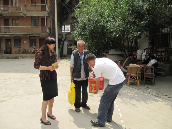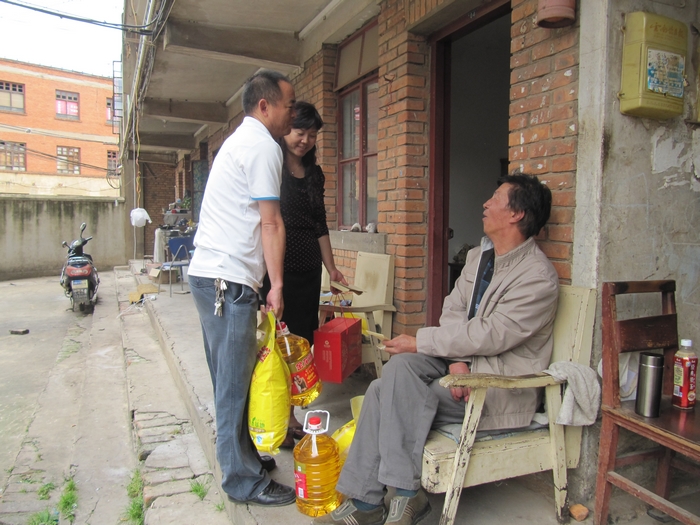首先慰問(wèn)的是直管部退休老職工李學(xué)智,今年73歲,一直單身,膝下無(wú)子女,獨自生活在宿舍區,一直以來(lái)直管部領(lǐng)導都特別關(guān)心他的生活起居,除節假日以外都會(huì )抽時(shí)間去看望他,我們去到他家時(shí),他剛好午睡完,看見(jiàn)我手里拿著(zhù)相機,他沒(méi)接我們遞給他的慰問(wèn)品,反而一本正經(jīng)地跟我說(shuō):“等一下,我穿好衣服戴上帽子再照可以嗎?”說(shuō)著(zhù)急急忙忙去穿外衣,帶上帽子才來(lái)接收,我們幾個(gè)都被他逗樂(lè )了,在帶給他領(lǐng)導的問(wèn)候和了解了他最近的生活和身體情況后,他說(shuō):“真的很感謝啊……”之后的話(huà)語(yǔ)由于方言和語(yǔ)速沒(méi)聽(tīng)太清,但是我發(fā)現他的眼眶噙滿(mǎn)了淚水。其實(shí)我們很清楚老人為什么會(huì )這樣的舉動(dòng),今年7月14日凌晨2點(diǎn),老人疼痛難耐,被直管部保安發(fā)現,負責保衛后勤的李本紅及時(shí)將老人送到西山區第一人民醫院,經(jīng)診斷老人患了急性胃穿孔,連夜手術(shù)保住了性命,手術(shù)全程以及之后的所有住院手續都是直管部負責陪護和辦理。