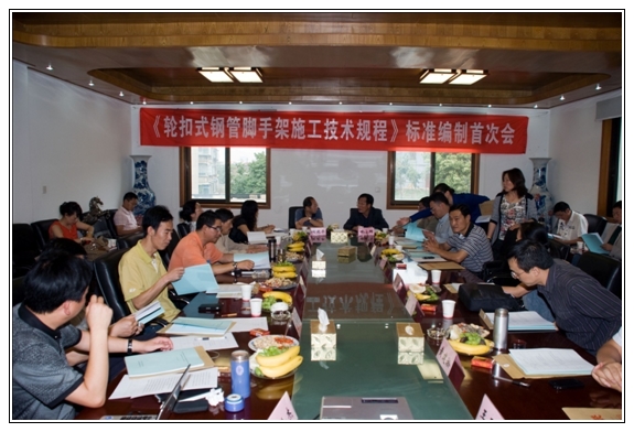 會(huì )上集團技術(shù)中心主任王劍非宣讀了本標準的主編、參編單位。周建平處長(cháng)宣布«輪扣式鋼管腳手架施工技術(shù)規程»編制組成立,這標志著(zhù)由我司作為第一主編單位的標準編制項目已正式啟動(dòng)。建設廳標準定額處周建平、建工集團總工甘永輝對我司編制的«輪扣式鋼管腳手架施工技術(shù)規程»給予了很高的期望,會(huì )議研究通過(guò)了標準的參編成員名單、各工作組分工、編制工作大綱、編制工作規則及進(jìn)度計劃。