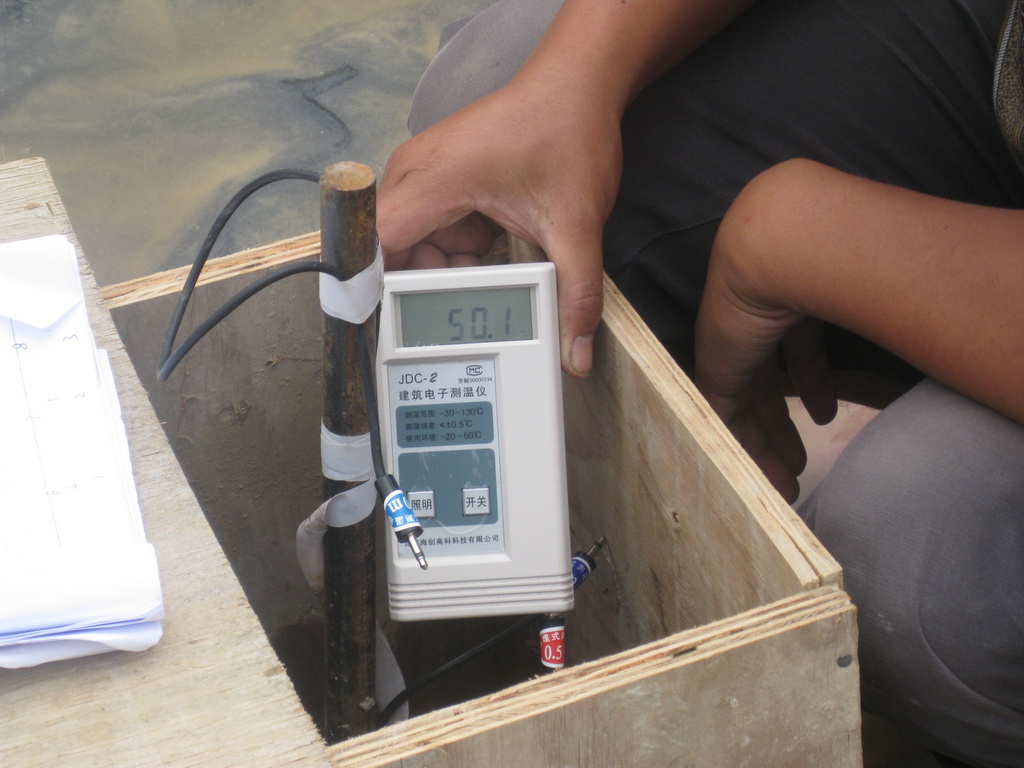根據我公司大體積混凝土施工的成功經(jīng)驗,在澆灌混凝土之前編制了基礎大體積混凝土施工方案,采取優(yōu)化配合比設計、設置澆筑分倉縫,合理確定澆灌順序,保證筏板不出現冷縫,采用蓄水保溫養護法,并根據規范要求布置了7個(gè)測溫點(diǎn)。