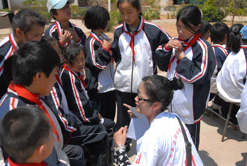 圖為青年志愿者與小學(xué)生交談時(shí)場(chǎng)景