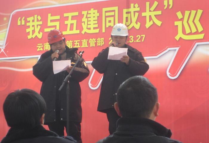 演講團共10名隊員,分為兩組,均是公司在2月份舉辦 “我與建工同成長(cháng)”演講選拔賽中踴躍出來(lái)的優(yōu)秀選手,他們于近日開(kāi)始展開(kāi)對各個(gè)基層項目的巡回演講活動(dòng)。落實(shí)董事長(cháng)、黨委書(shū)記楊福和的號召:“在集團成立60周年之際,借助一系列慶?;顒?dòng)打造五建文化,讓更多基層的職工通過(guò)青年的心聲了解和認同這種文化!”