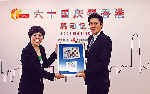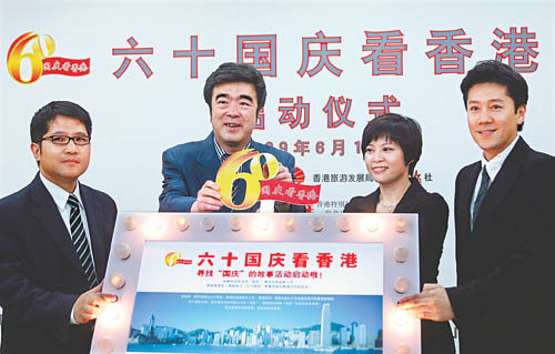 6月10日,為慶祝新中國60周年華誕,香港旅游發(fā)展局與中國青年報社聯(lián)合舉辦的“六十國慶看香港”系列活動(dòng)正式啟動(dòng)。香港特別行政區政府駐北京辦事處副主任陳選堯、中國青年報總編輯陳小川、香港旅發(fā)局中國內地總監葉貞德和著(zhù)名歌唱演員蔡國慶(從左至右)一同為活動(dòng)揭幕。