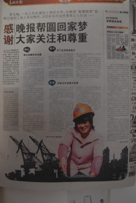 2013年1月28日春城晚報A2版02頁(yè)整頁(yè)報道了公司優(yōu)秀女農民工李玉梅的回家夢(mèng)。 李玉梅是五公司第三直管部玉溪市公租房項目部的鋼筋班組的一名女性,經(jīng)公司報送,省總工會(huì )審核后推薦,春城晚報記者到項目一線(xiàn)對她進(jìn)行了采訪(fǎng),并為她圓了回家的夢(mèng)。 文章從細心、艱辛、愿望三個(gè)方面描述了李玉梅到外地打工的情況,再現了公司不同層面的優(yōu)秀人才。 公司工會(huì ) 姜小明/報道